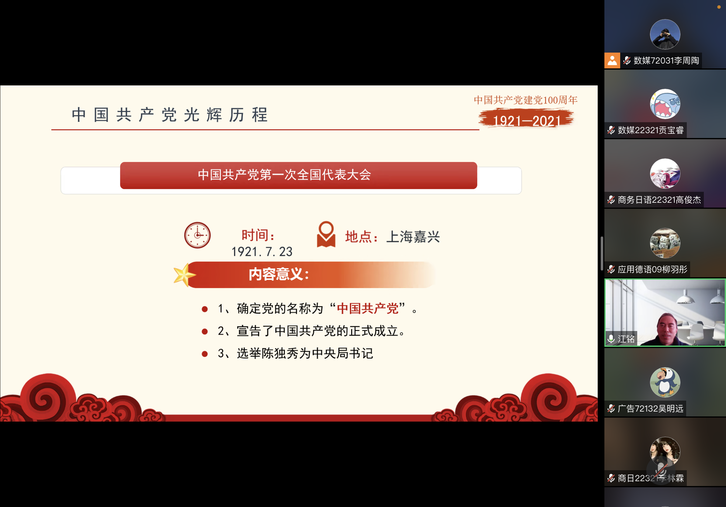 为深入学习贯彻党的二十大精神,用党的百年奋斗重大成就鼓舞和激励广大入党积极分子,切实把好党员发展入口关,设计艺术学院特邀学校关心下一代工作委员会秘书长、讲师团成员江铭同志为2022年第2期分党校培训班全体学员讲授《党的百年光辉历程》专题党课。