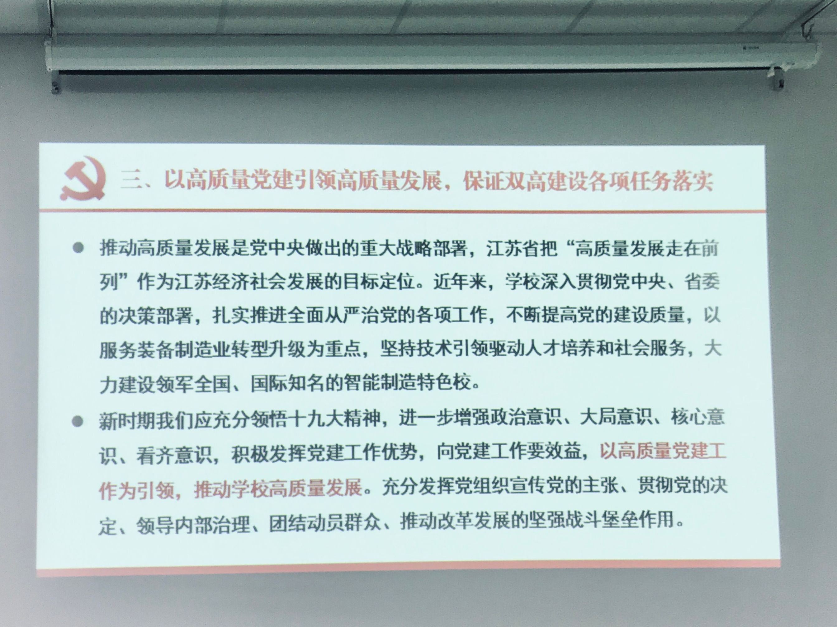 在专题党课上,周书记以《牢记初心使命——以高质量党建引领学校高质量发展》为题,紧扣“不忘初心、牢记使命”主题,从“充分认识党中央开展‘不忘初心、牢记使命’主题教育的重大意义”“牢牢把握‘不忘初心、牢记使命’主题教育的内容要求”“要在对党史的学习回顾中强化初心使命”等方面展开,结合生动的历史事例,就如何在新时代实现新作为新担当、怎样做到“不忘初心、牢记使命”提出明确要求。他还深入思考了高校党的建设和思想政治工作的方向性、根本性问题,对标找差,以加强思想政治建设、加强党的组织建设、加强作风建设、加强党建和双高建设融合的“四个加强”,勉励全体党员立足岗位悟初心、担使命,为学校高质量发展做出新贡献。他指出广大教职员工要坚持“以学生为中心”的理念,把主题教育与推进学院各项工作发展紧密结合起来,从学院发展最突出、最迫切的问题着眼,脚踏实地,真抓实干,主动对标找差距,坚持“边学边改、即知即改、应改尽改”,以高度的政治责任感、良好的精神状态和扎实的工作作风推进主题教育成果落地落地生根、发扬光大,确保学校在双高校建设的道路上实现新的跨越。党课结束后,省委第十巡回指导组成员通过问卷调查形式,抽取部分同志对党课质量和效果进行了测评。