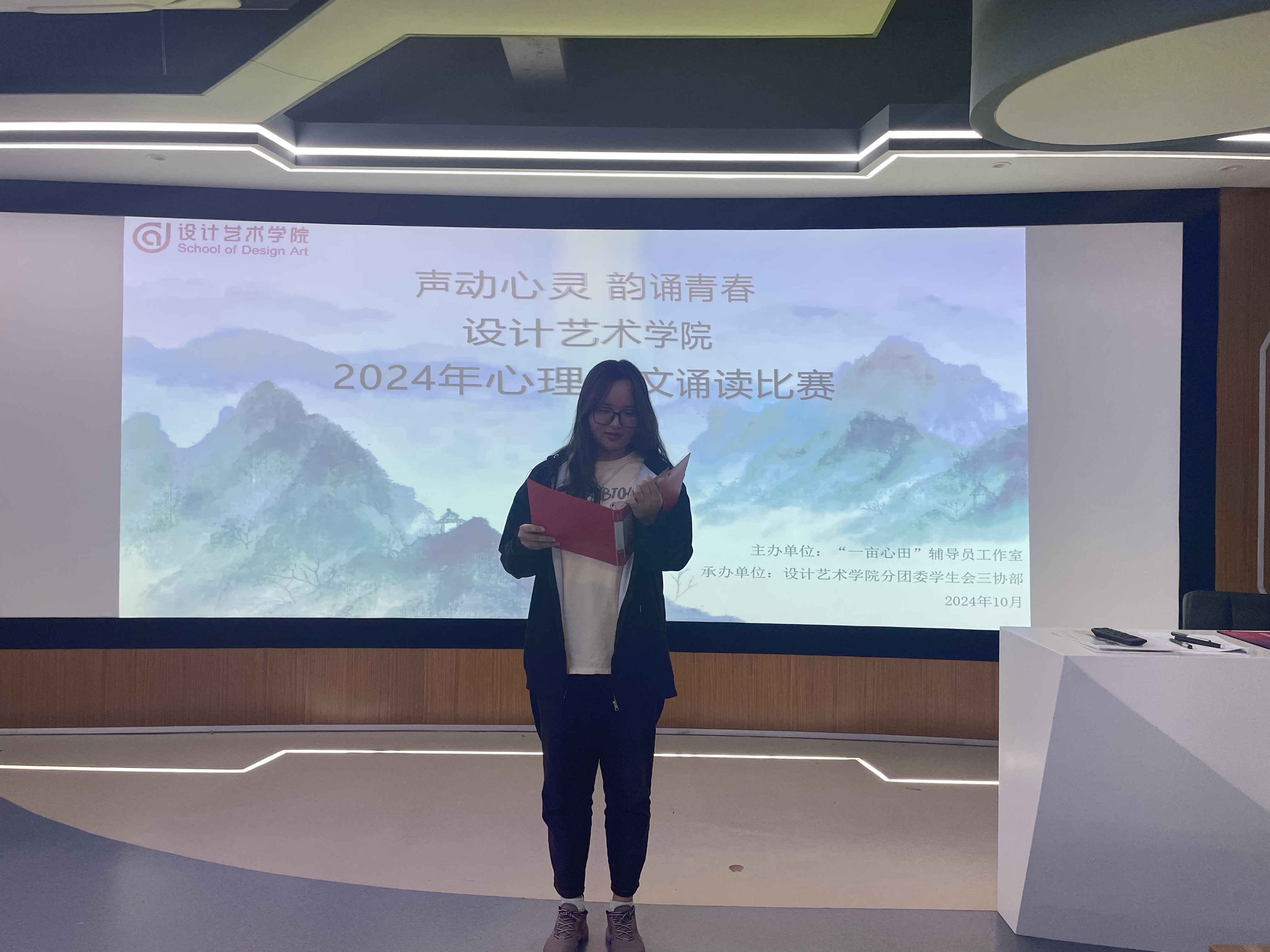 10月29日下午,设计艺术学院第二届“声动心灵,韵诵青春”心理美文诵读比赛成功举办,活动由一亩心田工作室、设计艺术学院分团委学生会联合主办,旨在通过诵读心理美文的方式,传播心理健康知识,引导学生关注自身心理健康,同时提升语言表达和朗诵技巧。