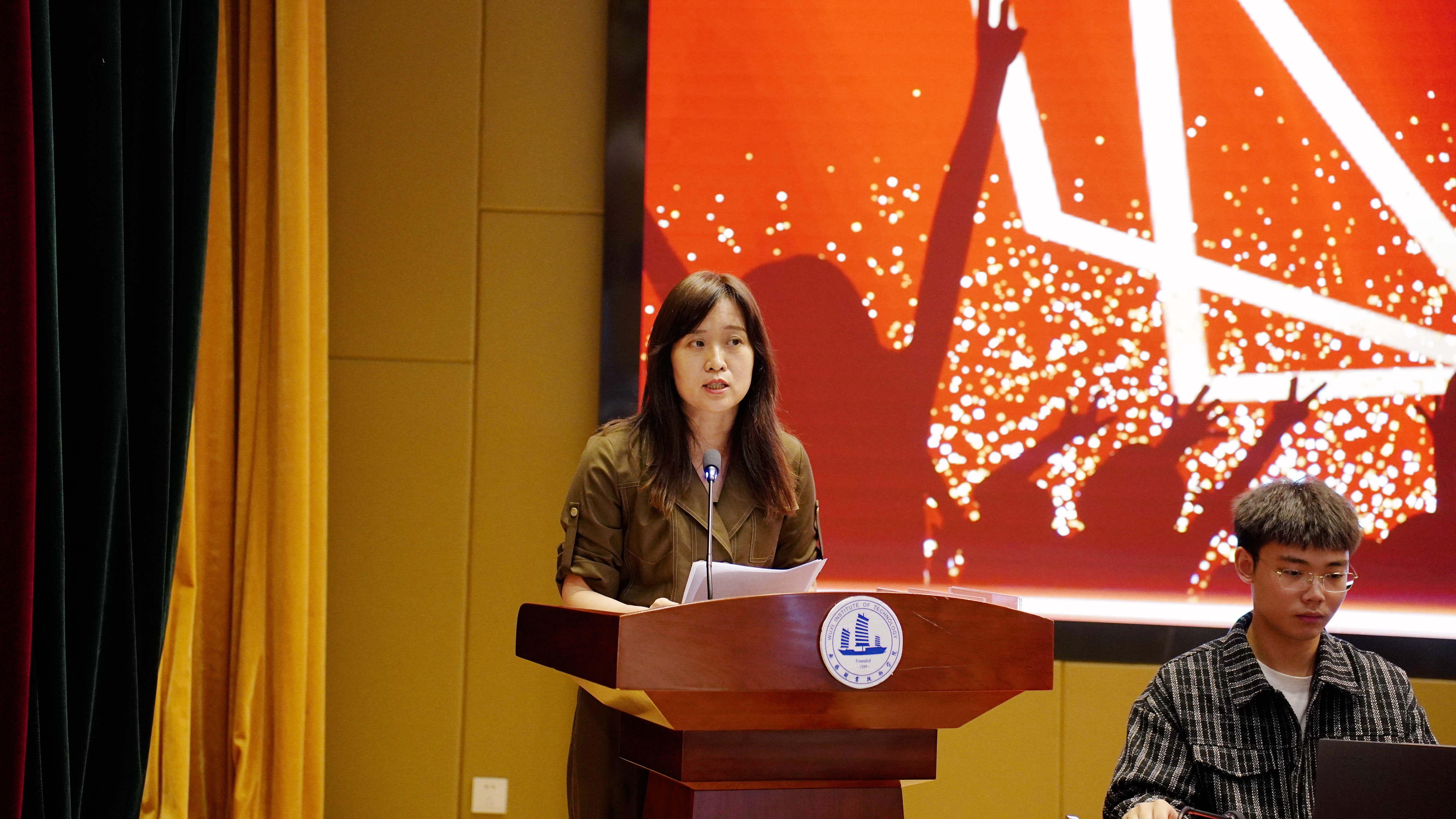 在教师代表发言环节,产品造型设计系周小溪博士鼓励新生无惧风雨,自信人生;选择远方,坚定前行;未来已来,拥抱变革,把握美好大学时光,开启多彩大学生活。