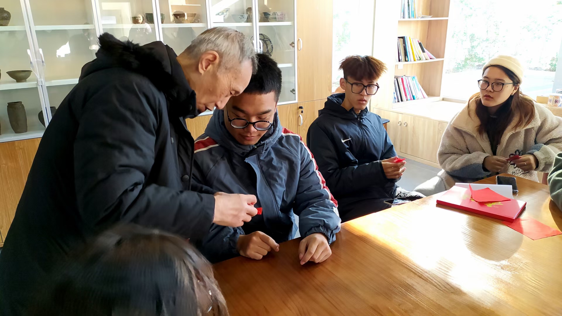 传统的民俗剪纸也承载着传统节日里的美好祝愿,营造着祥和的节日氛围。郭老师给大家讲述了“五福”的涵义,也带来了“福”字和原创的漫画老虎形象,让大家先从模仿开始,照样子剪出作品,为即将到来的春节做好准备。最后,师生们进行作品装裱展示并与郭老先生合影留念。