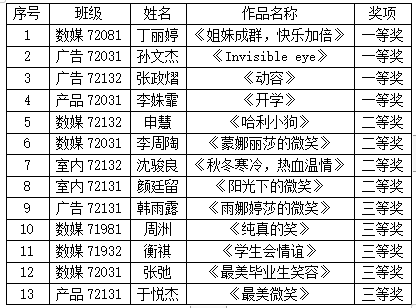 本次活动历时一月有余,得到了同学们的积极响应和热情参与,共收到学生作品50多个。比赛中涌现出了许多优秀的作品,同学们充分发挥了他们的观察力,体现了他们较好的素材挖掘、主题把控以及摄影水平。经分院评比,最终数媒72081班丁丽婷的《姐妹成群,快乐加倍》等4个作品荣获一等奖 ,广告72031孙文杰的《invisible eye》等5个作品获二等奖,数媒72132申慧的《哈利小狗》等5项作品获得三等奖。