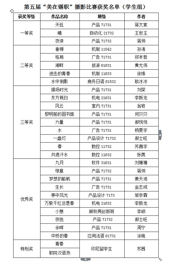 第五届“美在锡职”摄影比赛已经结束,本次比赛共征集到教工组作品75件、学生组作品200件。经评审,共有19件教职工作品和29件学生作品获奖,其中教工组一等奖作品3件、二等奖作品6件、三等奖作品10件;学生组一等奖作品3件、二等奖作品5件、三等奖作品9件、优秀奖作品10件,另设特别奖一项。在学生组一二三等奖评比中,全校共有17位同学获奖,我院同学占有9席,占到获奖比例的50%以上。以下作品为我院学生产品71731班学生蒋文宸和产品71732班学生蒋帅所拍摄,并同时获得一等奖,指导教师均为我院曹晓丹老师,其他同学所获奖项名单附后。