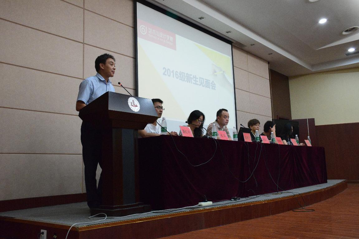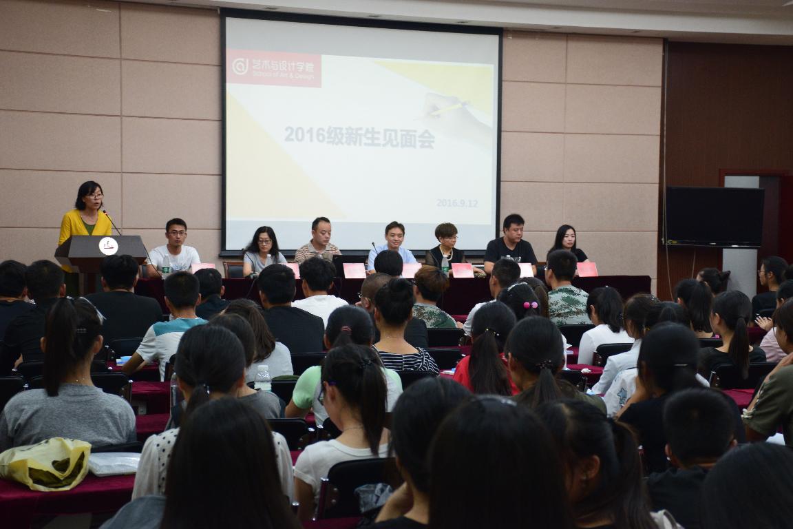 9月12日,艺术与设计学院2016级新生见面会在国教二楼报告厅正式召开。出席本次见面会的有学院党总支书记刘文平、学院副院长承剑芬,院长助理孟剑飞,各系系主任,及全体新生班班主任和2016级新生。