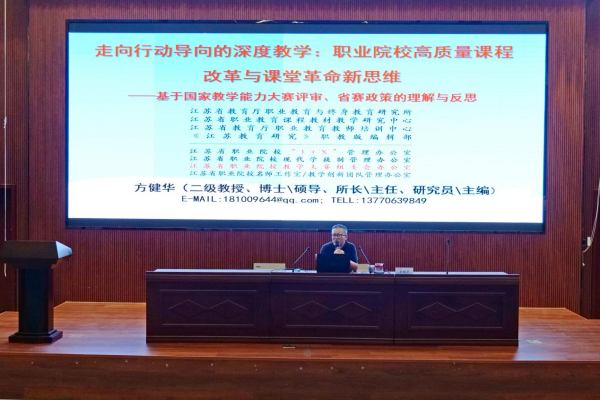国内知名专家、江苏省职业教育与终身教育研究所所长方健华教授带来的题为《走向行动导向的深度教学:职业院校高质量课程改革与课堂革命新思维》的精彩讲座。方所长通过对我国未来着力发展十大领域的分析,详细阐述了新时代新职教对于新人才、新专业、新教材、新岗位、新课程、新教学等方面的要求。学员们认真听讲,主动发言互动。