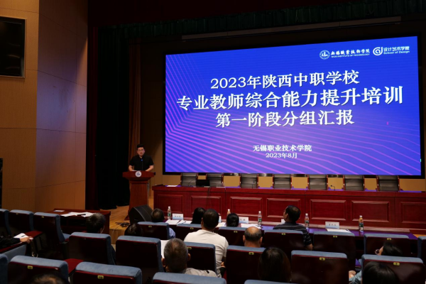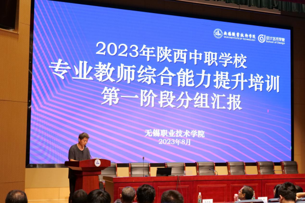 8月17日下午,全体学员在厚德楼报告厅进行了第一阶段分组考核培训汇报,无锡职业技术学院设计艺术学院院长杨敏、无锡职业技术学院继续教育学院副院长曹冬美、无锡职业技术学院管理学院教授于云波、无锡汽车工程高等职业技术学校原教务处处长杨正俊、无锡机电高等职业技术学校艺术设计系副主任(主持工作)刘本富等专家出席了汇报总结大会。彭娜、靳文娟、喻静、薛煜、夏泉、杨通达、杨玲侠、张丹丽、张冲宁、裴芳英、桂兵、乔智勇等12位学员代表分别进行了汇报,汇报了第一阶段10天的学习成果。汇报结束后杨正俊教授和刘本富副教授对学员的汇报进行了点评。设计艺术学院杨敏院长代表培训工作组致词。她提出,在陕西教育厅领导对此次培训的高度重视和关心下,本阶段培训的实施过程和学员反馈达到了预期效果,也感谢学员们的支持与配合,在各方共同努力下,第一阶段的培训取得圆满成功。