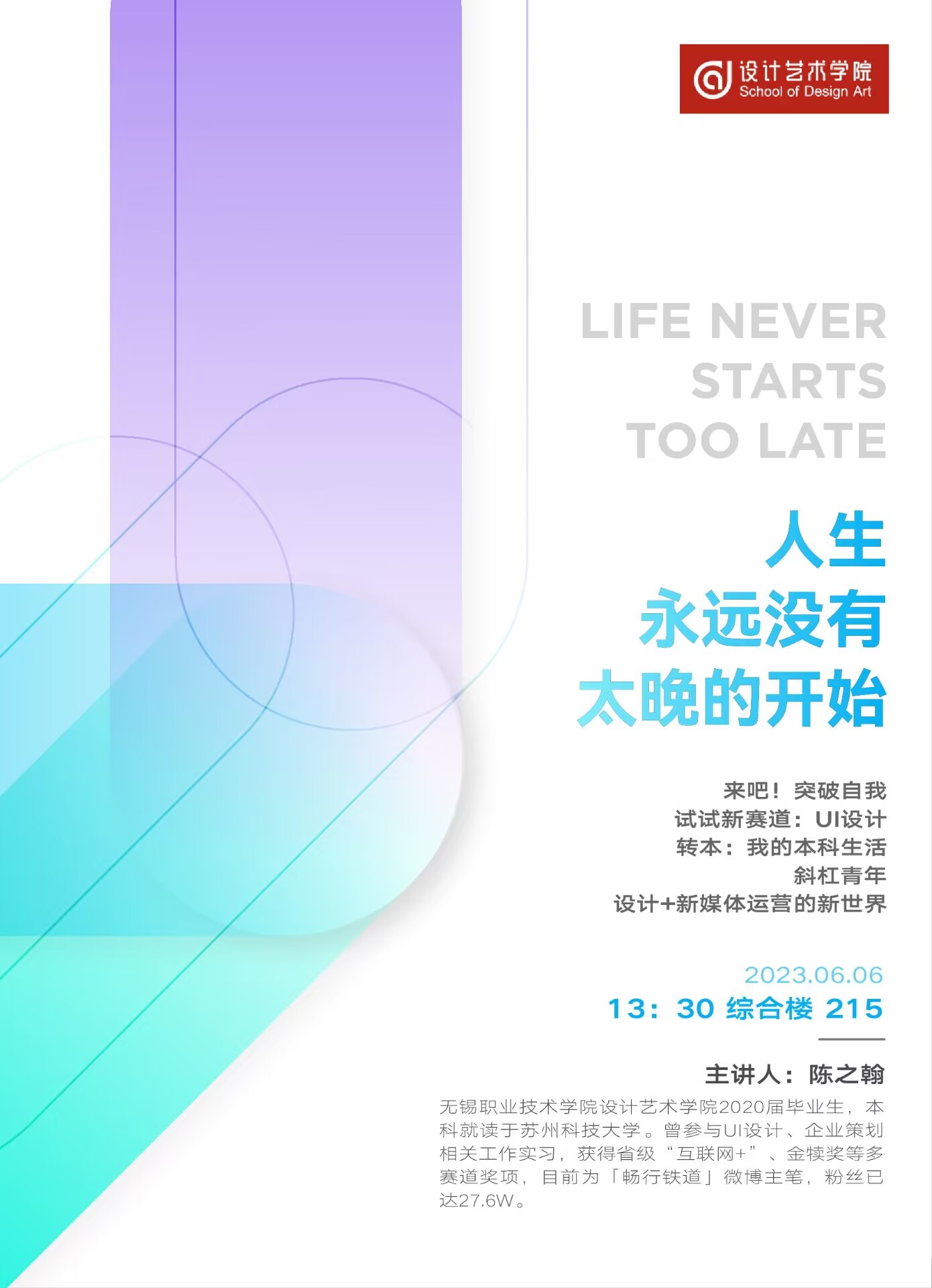 陈之翰为我院17鲁班创新班校友,本科就读于苏州科技大学视觉传达设计专业。在UI设计、新媒体运营等多个领域有着较为丰富的设计经验和实习经历,曾获得省“互联网+”创新创业大赛一等奖、时报金犊奖大陆赛区三等奖等诸多奖项,目前担任“畅行铁道”微博主笔,粉丝量近30万。在分享会中,陈之翰结合自己的本科毕设‘i园林’UI设计作品,介绍了品牌形象设计、交互界面设计在当下的运用和发展,强调了思维转化能力的重要性。他通过分享自己在新媒体运营领域的经验,引导学弟学妹们在设计、运营、文案的复合型人才培养赛道中把握机遇,迎难而上。此外,陈之翰就如何结合专业所学和个人兴趣,提前规划生涯之路,在充满未知和变化的学崖、职崖、生崖道路上实现更好的发展进行分享。在交流环节,同学们踊跃提问,向学长请教有关在校学习、转本、就业等方面的问题,让同学们对专业学习和职业目标有更了清晰的认知。