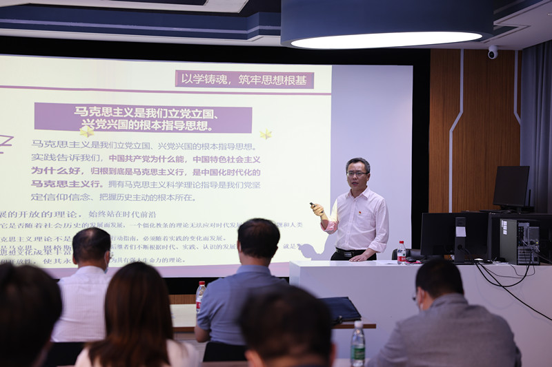 苗勇以《以学铸魂、筑牢思想根基;守正创新、做好文化传承》为题,从坚定理想信念、深刻认识“两个确立”的重大意义和广泛认同新时代取得的重大成就等三个方面阐述了筑牢思想根基的必要性,重点围绕“中国式现代化”这个关键词谈了自己学习贯彻党的创新理论的收获体悟;接着,他从贯彻“两个结合”的角度,介绍了近几年设计艺术学院在传承中华优秀传统文化方面所做的开拓性工作和取得的成效,最后,他结合学院专业特色,就如何将党建与业务工作深入融合,大力推进“党员工作坊”党建育人平台建设谈了下一步的工作思路。