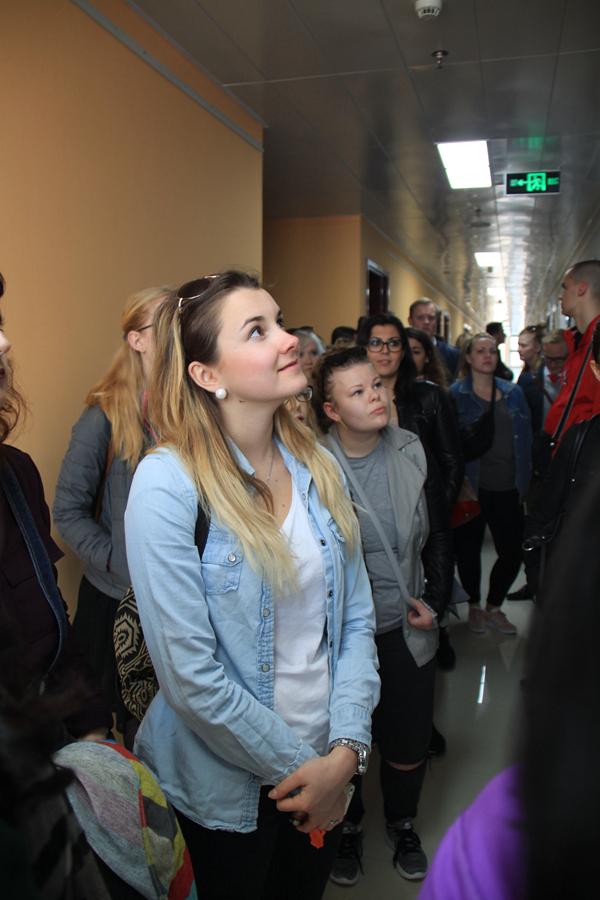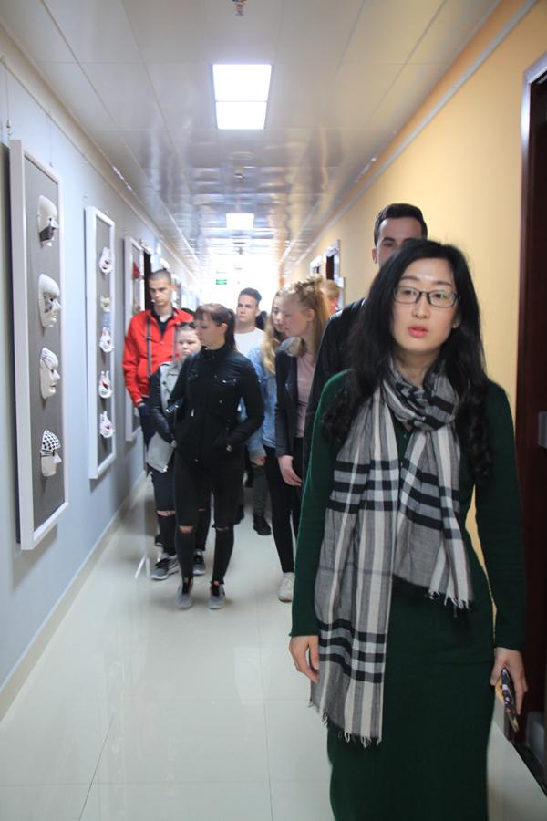 来访学生团到艺术与设计学院的各个楼层进行了观摩,张晶老师讲解了每个楼层专业系部的课程汇报展示作品设计灵感来源及制作过程;并带领学生参观了各专业特色实训室,展示了我院学生的学习环境;恰逢专业班级学生上课,欧洲学生们与正在上课的班级学生进行了简短的交流,了解他们在校学习情况等。随后,访问团还参观了我院学生工作室和大赛工作室,对正在备赛的项目作品虚拟动漫设计表示出强烈的兴趣,并在参观体验了学生作品以后赞许有嘉。