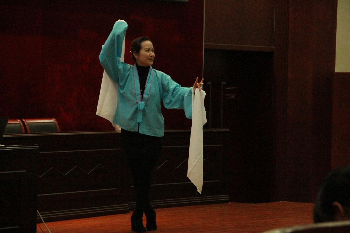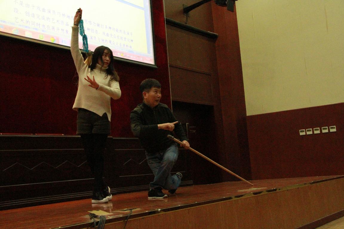 当天下午2点,小王彬彬和过之红老师刚踏入国际交流中心一楼报告厅,就以轻柔的言语赢得全场师生的好感和掌声。过之红老师是国家一级演员、无锡市文化艺术研究所副所长,著名锡剧“沈派”关门弟子,她给同学们详细讲解了锡剧的发展历史、流派以及王(彬彬)派、梅(兰珍)派、姚(澄)派、王(兰英)派、沈(佩华)派等著名流派的唱腔特点、表演形式、人物塑造、以及舞台上开门、关门、思考、哭的中国戏曲写意表现特点,还当场给同学们表演了一段四季春调《孟姜女哭长城》,引起全场掌声和欢呼声。