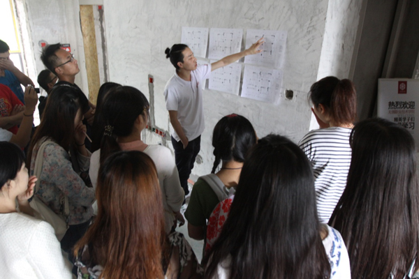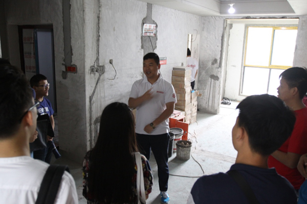 出发之前,王珏老师首先为同学们讲解了装饰施工现场参观的注意事项,提醒同学们注意自身安全。参观过程中,首先由“锦华装饰”负责本案的陈设计师从装饰施工中从量房、设计方案及施工图纸准备、开工准备、土建水暖电改造等等流程进行了详尽的介绍。同时对现代家装设计与施工细节进行了分析讲解,让学生更切实、更深入的了解了现代装饰施工的具体实际性问题的解决方法。讲解结束,让学生分组来亲身参与体验施工现场的各部分细节,同学们积极、认真的对照图纸与实体,或是用笔,或是拍照记录相关的信息,随时提出问题并有设计师为大家详细耐心的答疑解惑。