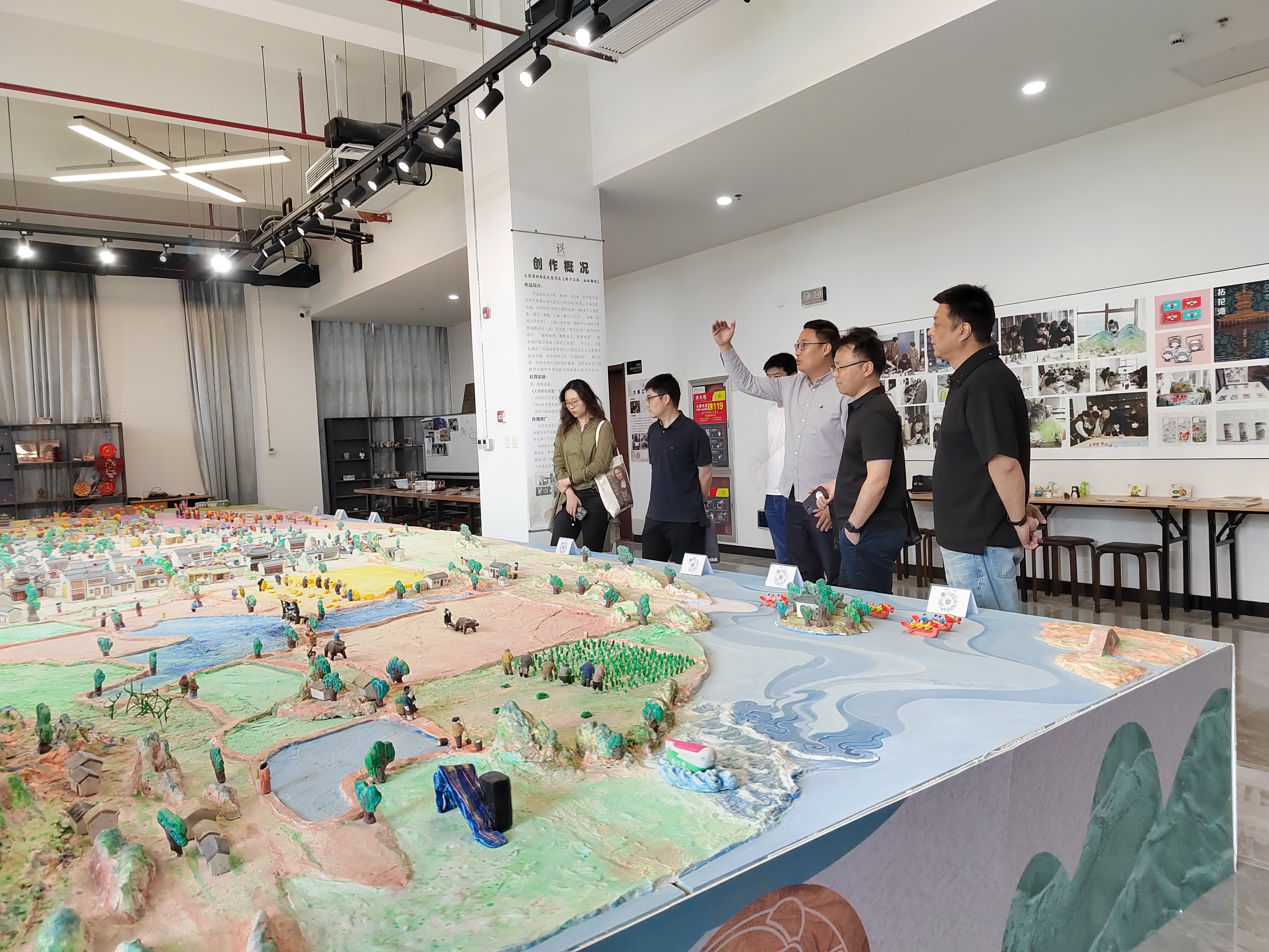会前,在环艺系主任王珏等人陪同下,肖飞副总经理一行实地考察了学院“绎江南文化传承创新基地”,对基地在传统文化创新设计领域的成果给予高度评价,认为其充分体现了学院的教学实践水平与产学研协同能力,并表示双方在文化IP开发、场景化设计等领域具有广阔合作空间。