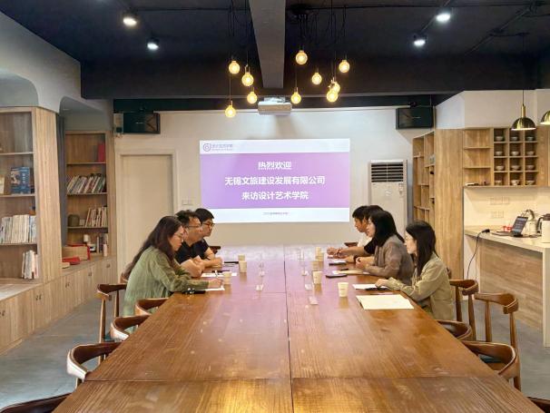 随后,双方围绕校企合作展开深入讨论。朱宏副院长详细介绍了公司业务板块、优秀案例、发展规划及人才需求情况,肖飞副总经理结合无锡文旅在蠡湖景观提升、古运河文化街区改造等项目的实践经验,提出校企协同培养“懂文化、精技术、能落地”的环境艺术设计人才需求,表示公司与设计艺术学院的专业设置、融合发展的理念高度契合,希望能在人才供给、文创产品开发等方面实现合作共赢。